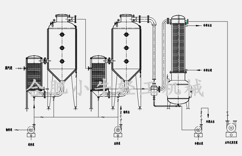 雙效外循環(huán)蒸發(fā)器(雙效濃縮器)主要由各效加熱器、各效分離器、冷凝器、冷凝液罐、真空泵、料液泵、閥門管路系統(tǒng)、電控系統(tǒng)組成。設(shè)備在運行時,料液進入分離器及加熱器的管程,鍋爐蒸汽進入一效加熱器的殼程,料液在真空狀態(tài)下沸點降低,當受熱到一定溫度后沸騰,并從噴射管噴入分離器,進行快速蒸發(fā)和汽液分離,未被蒸發(fā)的料液從底部循環(huán)管回流到加熱器再次噴入分離器,形成循環(huán)。由一效加熱器產(chǎn)生的二次蒸汽進入二效加熱器作為加熱介質(zhì),得到熱能充分利用,從而實現(xiàn)節(jié)能效果。二效蒸發(fā)器內(nèi)的物料運動狀態(tài)與一效同理,當料液縮到一定的程度,經(jīng)取樣確定合格后即可出料。而產(chǎn)生的二次蒸汽進入冷凝器殼程,被管程內(nèi)的冷卻循環(huán)水換熱冷凝成液相,進入冷凝水收集罐,最后排出。